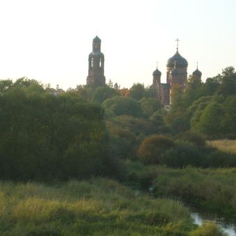The Spaso-Preobrazhensky Monastery features traditional Russian ecclesiastical architecture with multiple religious buildings spread across its expansive grounds, located east of Moscow.