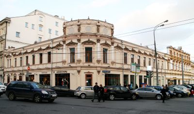 The building represents the intersection of residential and commercial life in Moscow, reflecting social patterns through its mixed-use design and ornate decorations.