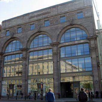 Nevsky Prospect 21 is a retail building with Art Nouveau design on Saint Petersburg's most famous street. The facade displays three monumental stone arches with large windows framed by decorative sculptural elements created by V.V. Kuznetsov.