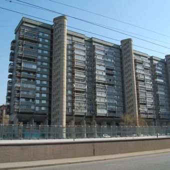 The Aviators apartment house is a 13-floor residential building in the Begovaya district, designed in brutalist and Soviet Modernist styles with exposed concrete and sharp geometric lines. The structure features stacked balconies, repeating window grids, and open stairwells that define its exterior rhythm.