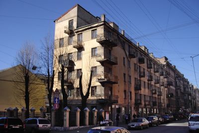 The seven-story residential structure at number 7 Rubinstein Street displays angular geometric forms and functional design elements characteristic of 1930s Soviet architecture.