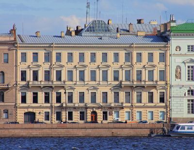 The Sklyaev Mansion stands along the Palace Embankment, featuring architectural elements typical of early 18th-century Saint Petersburg residential buildings.