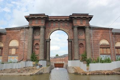 New Holland Basin is an artificial water body in Saint Petersburg connected to the Moika and Neva rivers through canal systems. The rectangular basin features stone embankments and red brick structures that form the island's distinct character.