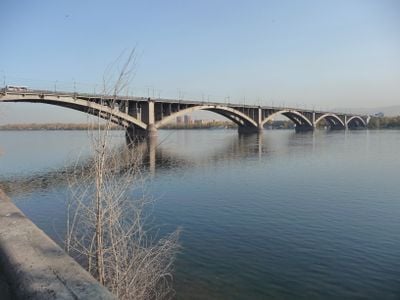 The Kommunalny Bridge stretches 2300 meters across the Yenisei River, connecting the Central and Sverdlovsk districts through Leisure Island with a causeway.