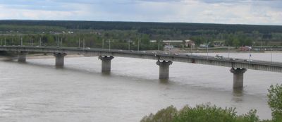 The Kommunalny Bridge extends 640 meters across the Tom River, connecting different sections of Tomsk with its concrete and steel structure.