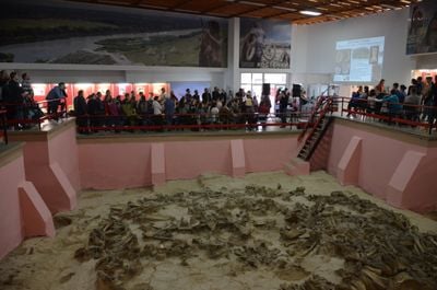 The museum building, constructed directly over an ancient dwelling site, preserves the original archaeological layers and mammoth bone structures in their discovery position.