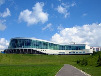The Congress Hall features a glazed facade with traditional Bashkir patterns and stands near the Belaya River in the central district.