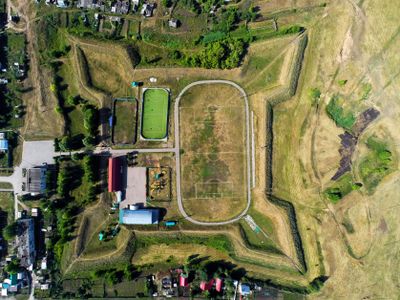 The remaining earthen ramparts of the fortress are now surrounded by modern sports facilities, including a football stadium and children's playground.