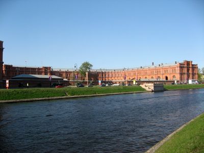 Kronverkskaya Embankment is a pedestrian waterfront path along the Kronverksky Strait that connects two major city avenues. Stone railings line the way as fortification structures of the adjacent fortress create the visual backdrop.