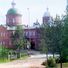 The monastery complex includes several buildings constructed in Byzantine-Russian architectural style with traditional onion domes and ornate decorations.