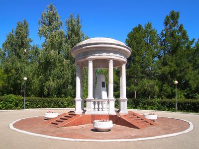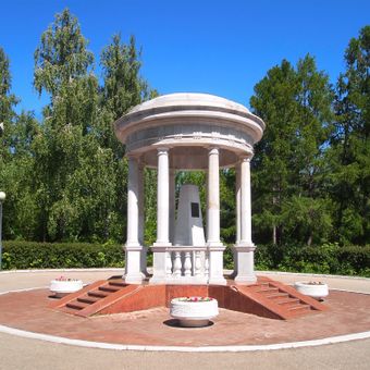The Goncharov Memorial Gazebo features eight Doric columns supporting a dome with a central four-sided obelisk containing memorial plaques and relief portraits.