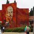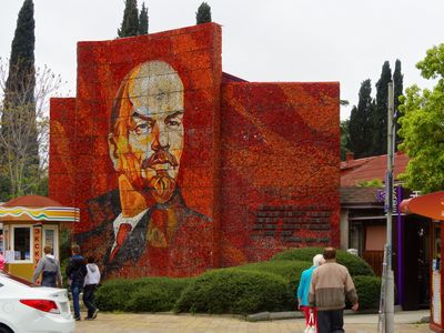 The Lenin Monument in Sochi features a bronze statue of Vladimir Lenin holding the Pravda newspaper, surrounded by palm trees and roses.