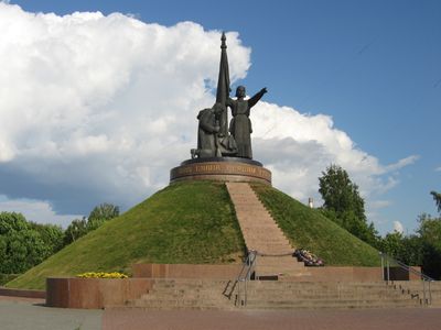 The memorial honors Vasili Chapaev, a Red Army commander who led forces during the Russian Civil War before his death in 1919.