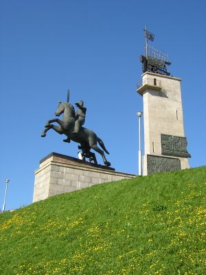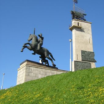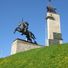 A bronze sculpture of a horse with a Soviet warrior stands 8 meters tall on a granite platform, with a 23.5-meter brick tower displaying bas-reliefs.