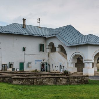 The Prikaz House stands as a two-story stone structure with traditional Russian architectural elements near the center of Pskov.