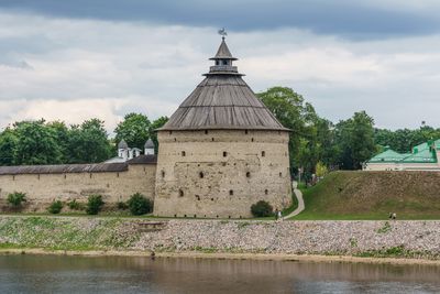 Pokrovskaya Tower is a medieval stone structure on the banks of the Velikaya River, standing approximately 52 meters tall with thick defensive walls. Built around 1500, it features multiple floors and demonstrates the military construction methods typical of its era.