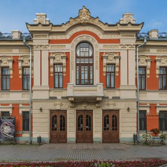 Located on Pushkin Street, the Academic Drama Theatre features classic Russian architectural elements with columns adorning its main entrance and symmetrical facades.