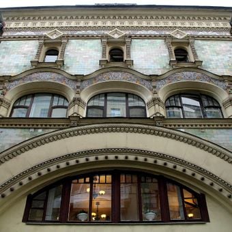 The five-story stone structure features multiple pointed towers, decorative ceramic tiles, and large semicircular windows divided by balusters on its exterior facade.