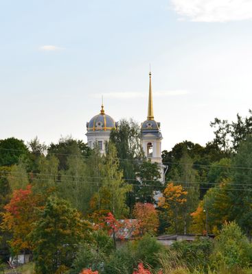 The Saint Catherine Church stands as a structure with white walls, multiple domes, and traditional Orthodox architectural elements near Pavlovsk Palace.