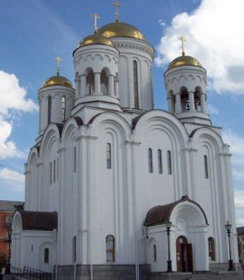 The Transfiguration Church stands with characteristic Eastern Orthodox architectural elements, including domed roofs and religious symbols across its exterior walls.