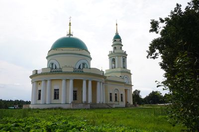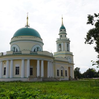 The Church of Saint Michael features classical and Empire style architecture with a prominent bell tower at coordinates 55.477528 latitude and 36.393417 longitude.