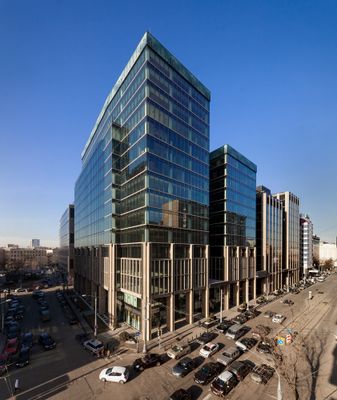 The office center incorporates modern architectural elements with an arcade connecting the two main structures and private terraces on select office floors.