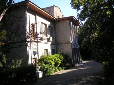 The Karasan property includes a villa designed in Moorish Revival style with ornate loggias, granite columns, and decorative windows facing the Black Sea.