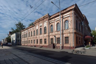The École Réale de Tomsk stands as a regional heritage stone building with classical architectural elements and decorative window frames on Pirozhkova Street.
