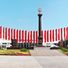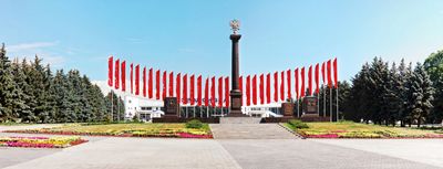 Four square pillars contain bronze bas-reliefs depicting military victories and historical events from the city's defense during World War II.
