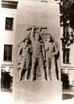 This 1976 memorial honors 185 students and teachers from the Leningrad Mining Institute who died during World War II and the Siege of Leningrad.