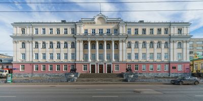 The building's design incorporates statues of miners on its fourth-floor balcony, representing the industrial heritage of the Perm region.