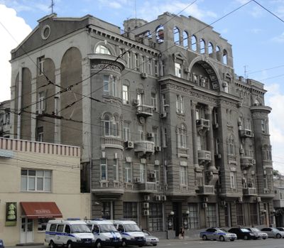 The structure represents early 20th century Russian residential architecture, with decorative elements that include antique-style sculptures that adorned the pediment until 1917.