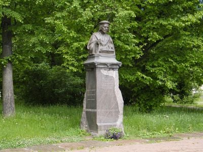 Mikael Agricola bust by Emil Wikström, Bronze monument in Theatre Square, Vyborg, Russia.