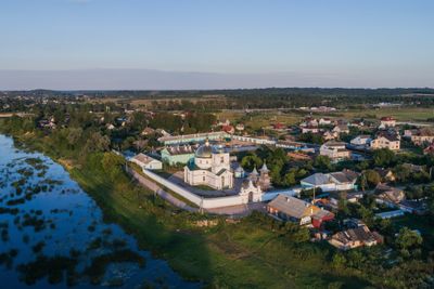 The Simanskiy Spaso-Kazan monastery features traditional Russian Orthodox architecture with intricate details along the banks of the Velikaya River.