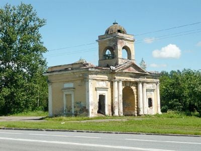Alexander Gates, Neoclassical landmark gate in Okhta district, Saint Petersburg, Russia.