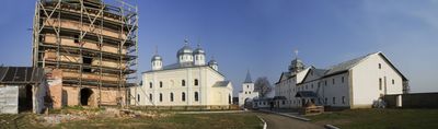 The Saint George Meshchovsky Monastery stands as a religious complex with a central church structure in the Kaluga Oblast region of Russia.