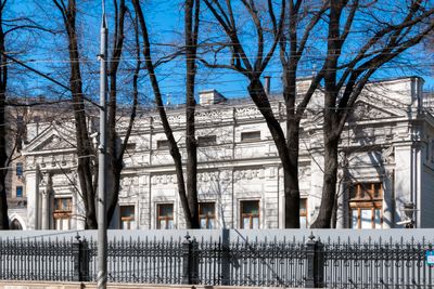 The Varvara Morozova Estate features symmetrical forms and strict architectural lines, representing a notable example of 19th-century neoclassical design in Moscow.
