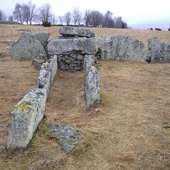 Ekornavallen is an archaeological site containing four passage graves, numerous cairns, twelve standing stones, and eight round stone settings spread across an open field. These different types of monuments span thousands of years and show how prehistoric communities marked important places for their dead.