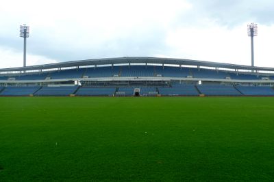 Malmö Stadion features a traditional athletic track surrounding the football field, with two main stands offering seating capacity for 26,500 spectators.