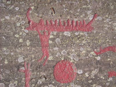 The petroglyphs at Himmelstalund display intricate depictions of ancient Scandinavian life, including human figures, animals, and boats similar to the Hjortspring vessel.