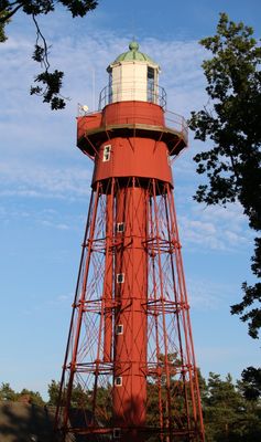 The red tower with a greenish lantern dome rises 29.4 meters above the southern Swedish coast near Bornholm Sound.