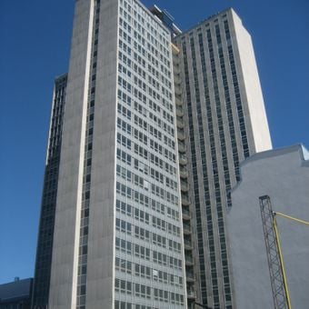 A renovation project added a top-floor skybar, transforming the former tax authority building into a mixed-use residential and commercial center.