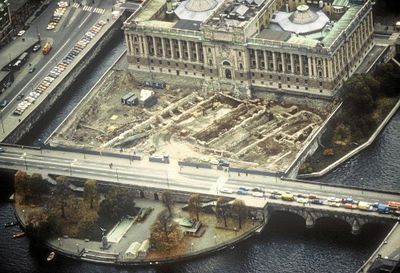 The Riksgropen excavation extends across a significant portion of Helgeandsholmen island, revealing multiple layers of urban development beneath Stockholm's surface.
