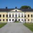 Taxinge-Näsby Castle stands by a lake with white exterior walls, large windows, and symmetrical architecture reflecting Swedish neoclassical design principles.