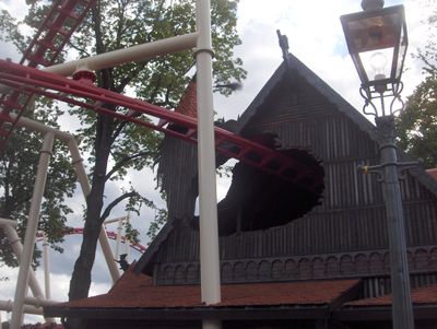 Riders dangle their legs freely beneath the track while passing near the Spökhuset haunted house during the 63-second journey through various twists and turns.