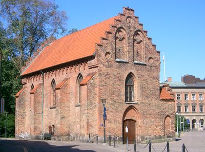 The red brick structure stands near Lund Cathedral, featuring architectural elements that reflect its construction period from the 15th century.