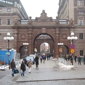 Riksgatan extends 117 meters between the eastern and western buildings of the Swedish Parliament House on Helgeandsholmen island in central Stockholm.