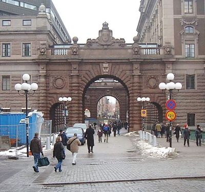 The Parliament House buildings along Riksgatan display notable architectural elements from the early 20th century, including decorative facades and spanning triumphal arches.