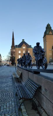 Created between 1985 and 1989 by Bengt-Göran Broström, the sculpture represents workers cycling to and from the Asea electrical company during shift changes.