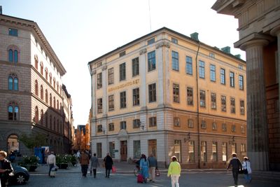 The building near Mynttorget square represents Swedish institutional architecture and stands among governmental structures in Stockholm's medieval district.